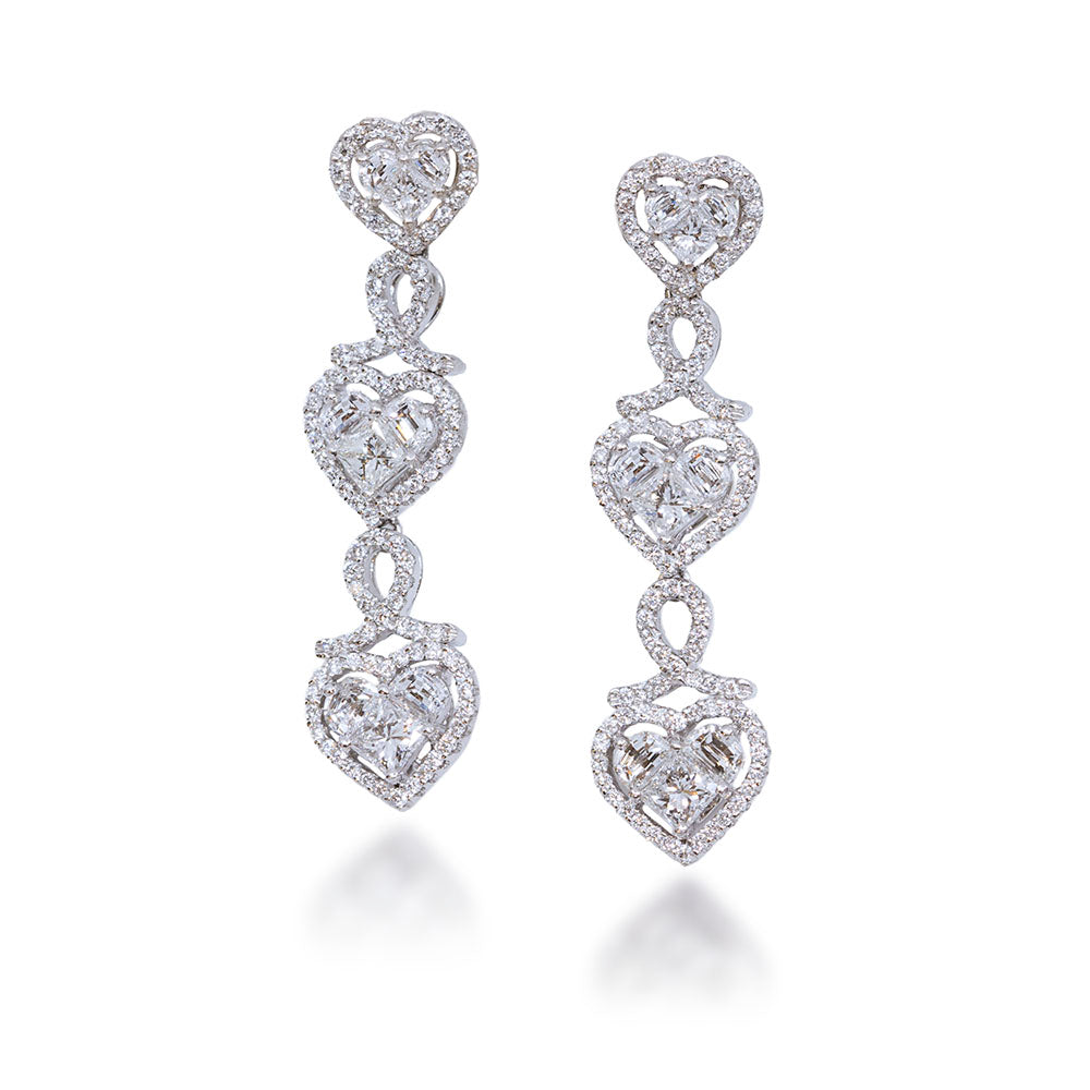 Regular price $22,000.00These 18K white gold earrings feature three cascading heart motifs, each elegantly formed by a central princess-cut diamond flanked by two half-moon cut diamonds for a captivating silhouette, encircled by a heart-shaped halo of pavé round brilliant diamonds. The innovative detachable design allows the top heart to wear as a stud, with the lower two converting to dangle drops via swirling links for versatile styling. Perfect for romantic evenings or everyday elegance, they capture layered affection with brilliant sparkle.
