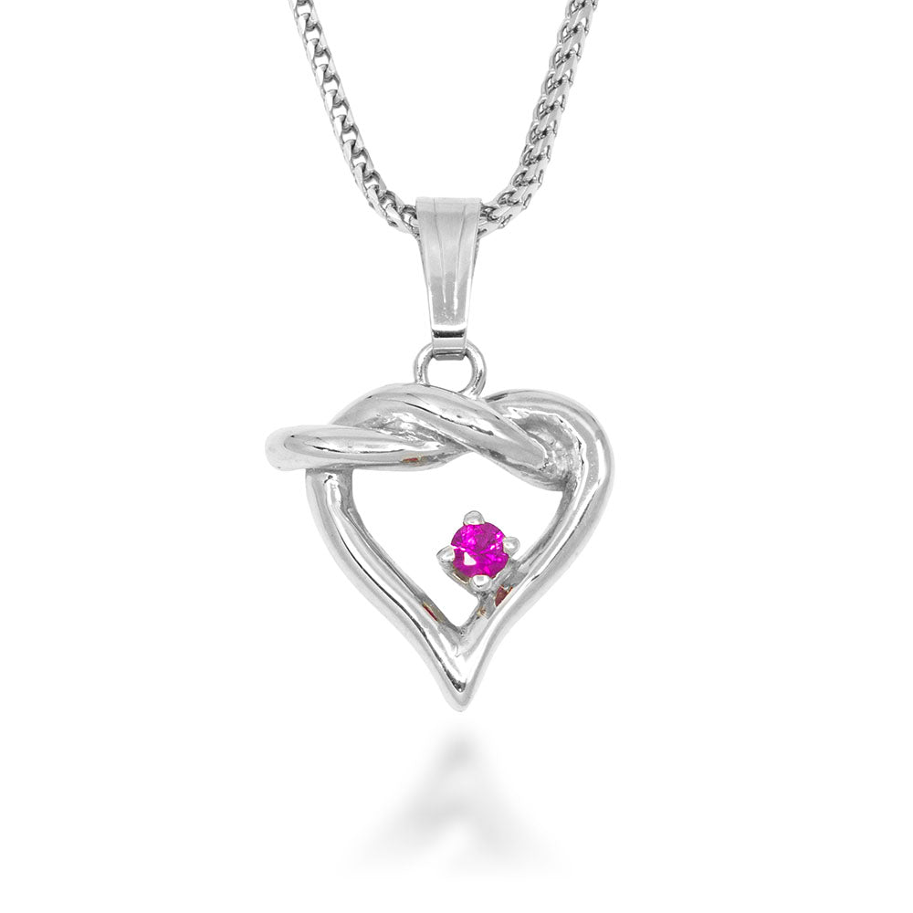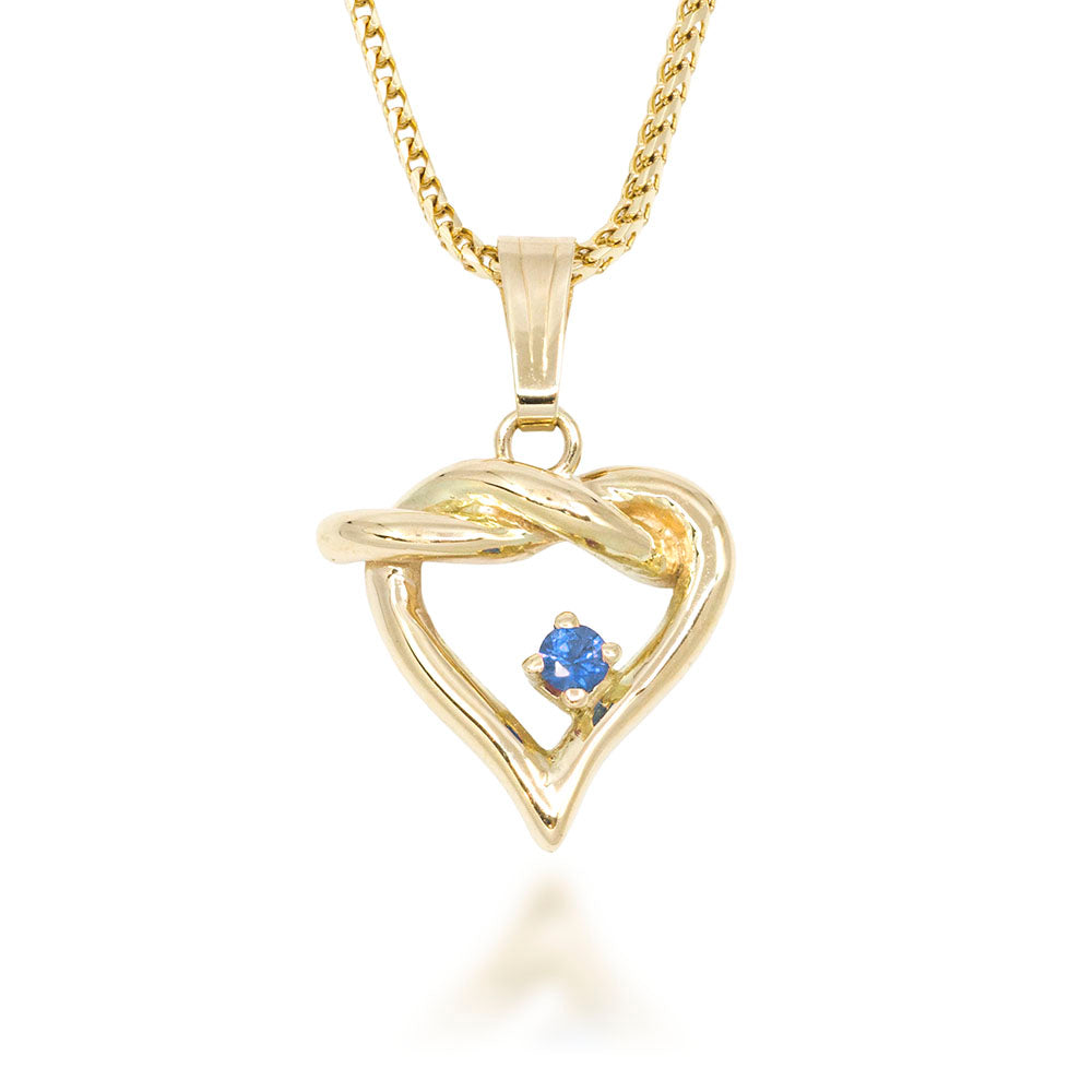 Regular price $630.00The Lovers’ Weave Heart Pendant, where timeless romance meets luxurious craftsmanship. Made in 14K yellow or white gold, this pendant showcases a delicately woven heart motif, emblematic of eternal love and intertwined destinies. At its core gleams a hand-selected ruby, evoking fiery passion, or a sapphire, radiating tranquil depth – each stone meticulously set for maximum brilliance.