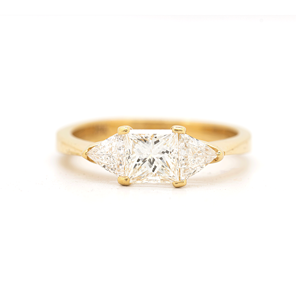 Regular price $15,360.00 Sale price $13,800.00 Save 10%Celebrate your love with this timeless three-stone engagement ring, where radiant princess and triangular cut diamonds unite in perfect harmony. Each stone is meticulously set in a classic elegant design that captures light from every angle, creating an enchanting sparkle. This sophisticated piece balances traditional craftsmanship with contemporary brilliance, making it an heirloom-worthy symbol of your commitment. The seamless arrangement of diamonds showcases their individual beauty while creating a stunning unified presence on the finger.
